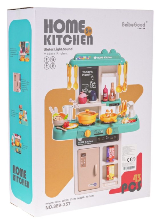 Interaktywna kuchnia z funkcją światła, dźwięku i kranikiem, z którego wydobywa się woda, a także mnóstwem akcesoriów, dla dzieci od 3-go roku życia. Kuchnia została znakomicie wykonana, z najlepszej jakości plastiku i jest w żywych kolorach zachęcających dziecko do zabawy. Na blacie kuchni znajduje się interaktywna płyta z palnikami. Po przekręceniu jednego z pokręteł słychać odgłosy gotowania, a drugiego, odgłosy smażenia. Odgłosom gotowania i smażenia towarzyszy podświetlenie palników. Z kranu faktycznie wypływa woda, jak w prawdziwym zlewie, dziecko będzie mogło umyć zabawkowe naczynia. W zestawie mamy też atrapę lodówki z otwieranymi drzwiczkami oraz półeczki, na których ułożyć możemy atrapy produktów. Cały zestaw prezentuje się znakomicie. Zabawka zasilana jest bateriami typu 3 x AA 1,5 V (brak w zestawie).