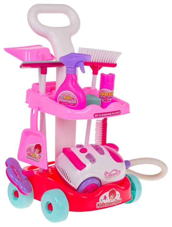 Bogato wyposażony zestaw sprzątający z interaktywnym odkurzaczem dla dzieci od 3-go roku życia. Zestaw wykonany został z najlepszej jakości plastiku w żywych kolorach. Na zestaw składa się wózek z rączką do pchania i kółeczkami oraz dwoma półeczkami, interaktywny odkurzacz, miotła i akcesoria do sprzątania. Odkurzacz zasilany jest bateriami typu 3 x AA 1,5 V (brak w zestawie), wydaje odgłosy odkurzania, posiada oświetlenie oraz wciąga drobne zanieczyszczenia z powierzchni.