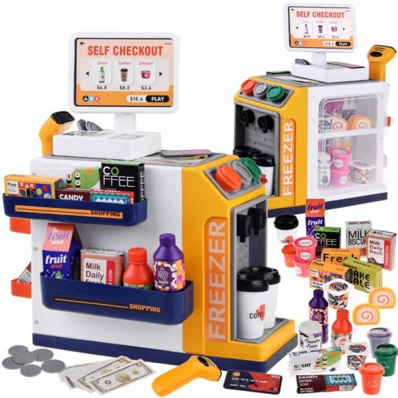 Samoobsługowy sklep spożywczy z ekspresem do kawy, lodówką na napoje to taka szybka "ŻABKA". Szybki punkt obsługi to propozycja dla wszystkich małych przedsiębiorców, którzy nadążają za nowościami w obsłudze klientów. Cały sklep to ekspres do kawy, lodówka na napoje, desery i kasa fiskalna z czytnikiem. Świetny pomysł na zabawę w sprzedawcę, punkt obsługi z napojami, przekąskami.